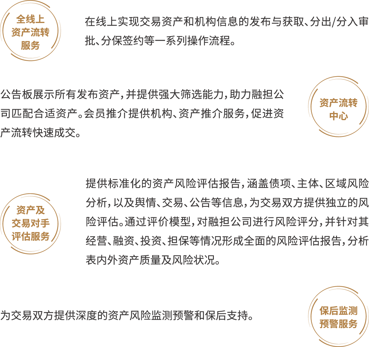 - 针对融担资产与交易对手的专业评估提供专业的资产评估报告和融担机构评估报告,为交易双方准确把握流转资产风险和交易对手风险提供支持。同时还引入中证鹏元等专业评级机构,可为交易双方提供定制化的风险评估服务。
