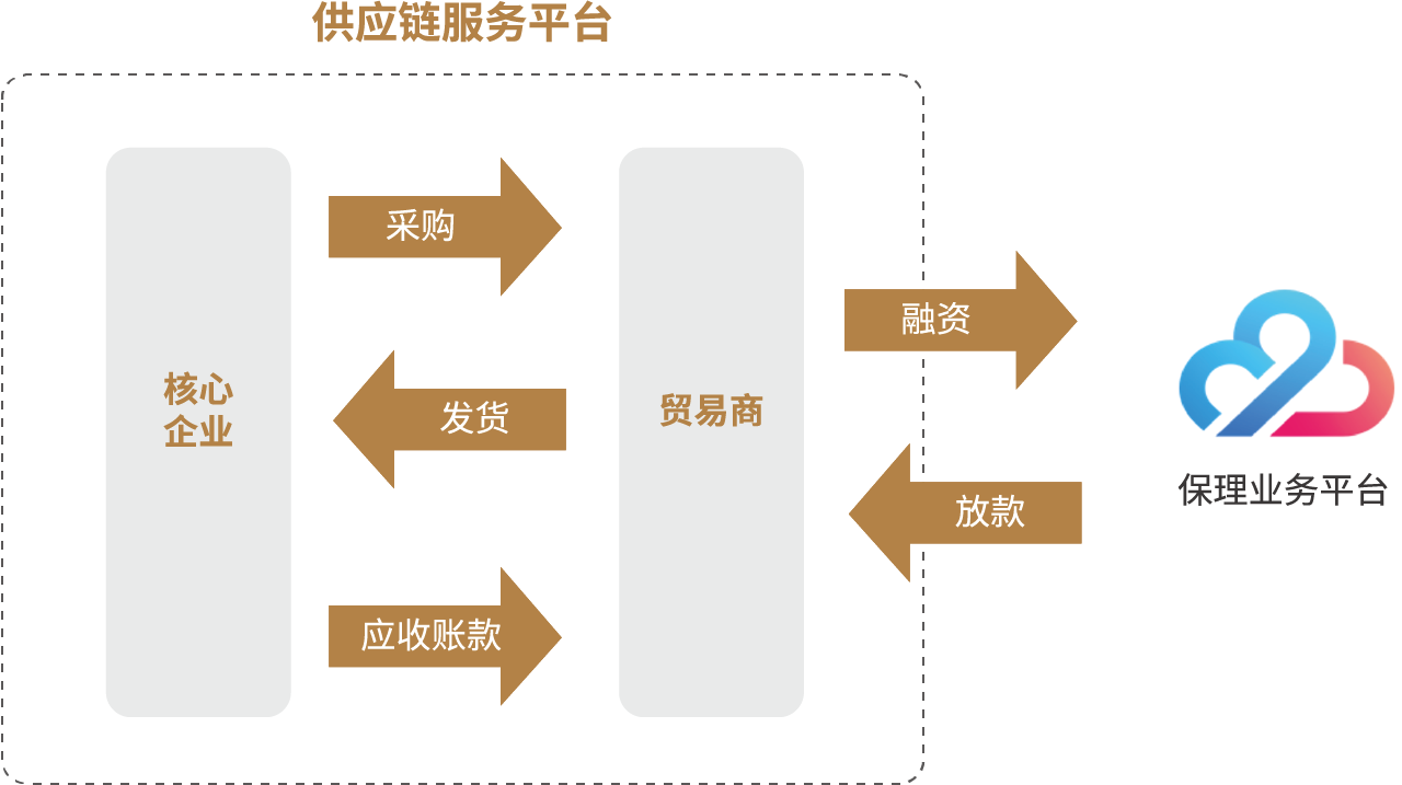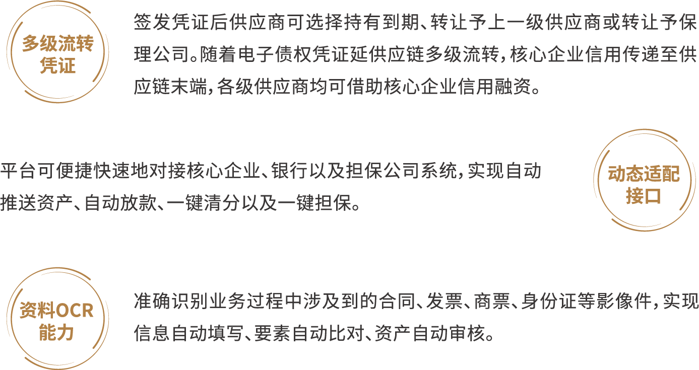 - 实现产融协同打通供应链与资金端之间的通道,为供应链全链条提供金融支持。为企业提供了灵活高效的融资解决方案,助力企业快速回笼资金,提高资金周转率。同时,为保理公司提供优质、可信资产,提高保理公司业务拓展能力。