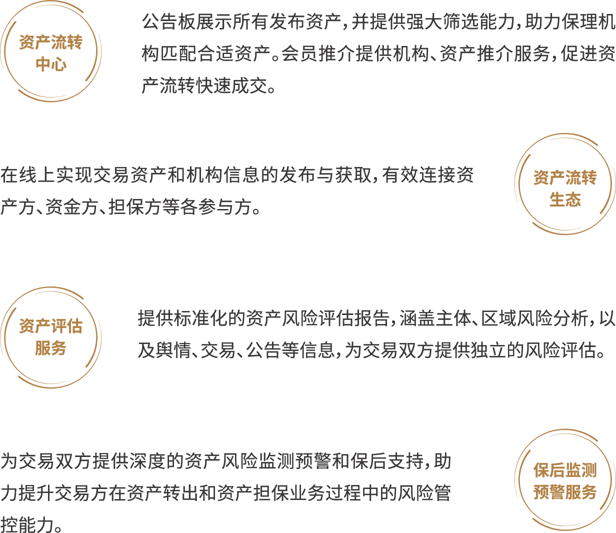 - 支持一对多、小额快速的资产流转模式资产流转服务支持多个交易对手参与流转,极大地降低了资产流转中可能出现的单一交易对手违约造成的信用风险。