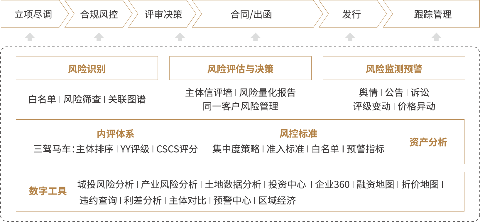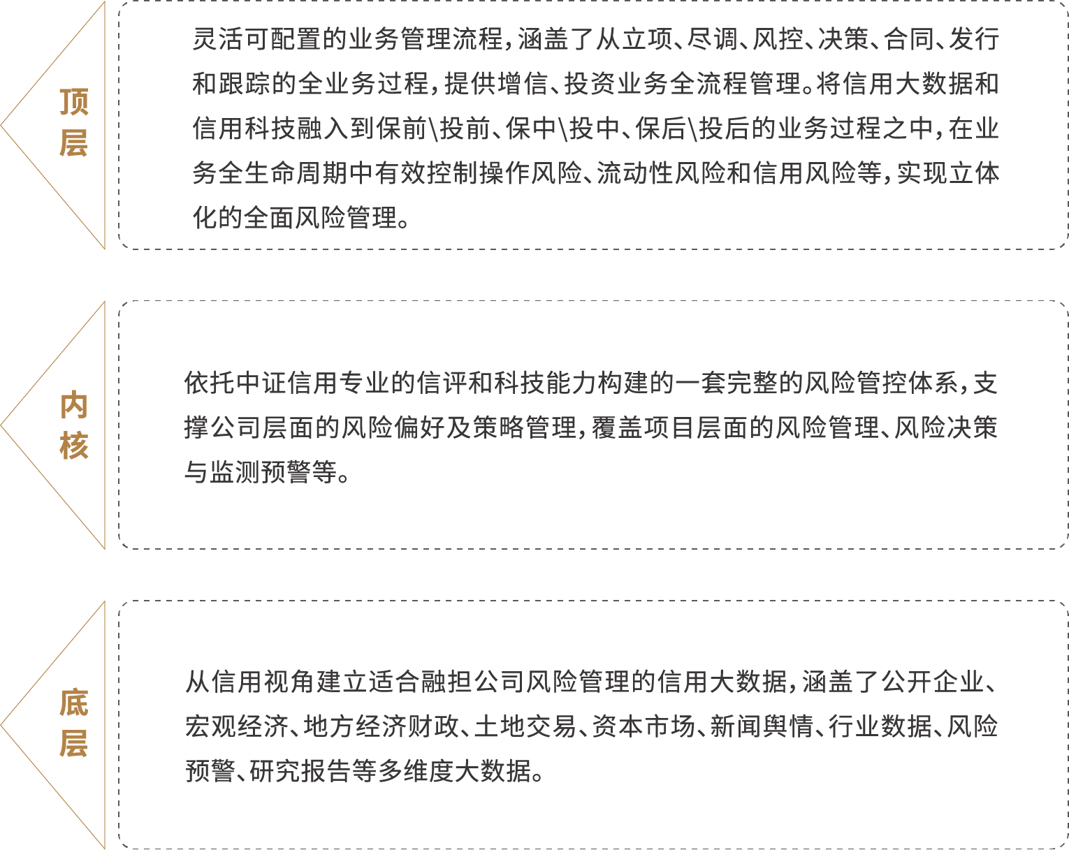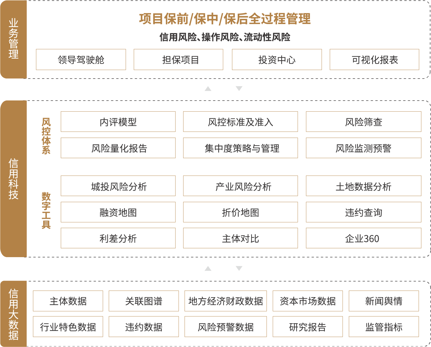 - 融合专业信用分析和科技能力依托中证信用以及旗下中证鹏元、瑞霆狗YY等强大的信评及投资分析能力,建立领先的信评模型和风险分析框架,将风险管控融入到全业务过程中,实现对风险的识别、分析、评估、决策和预警。