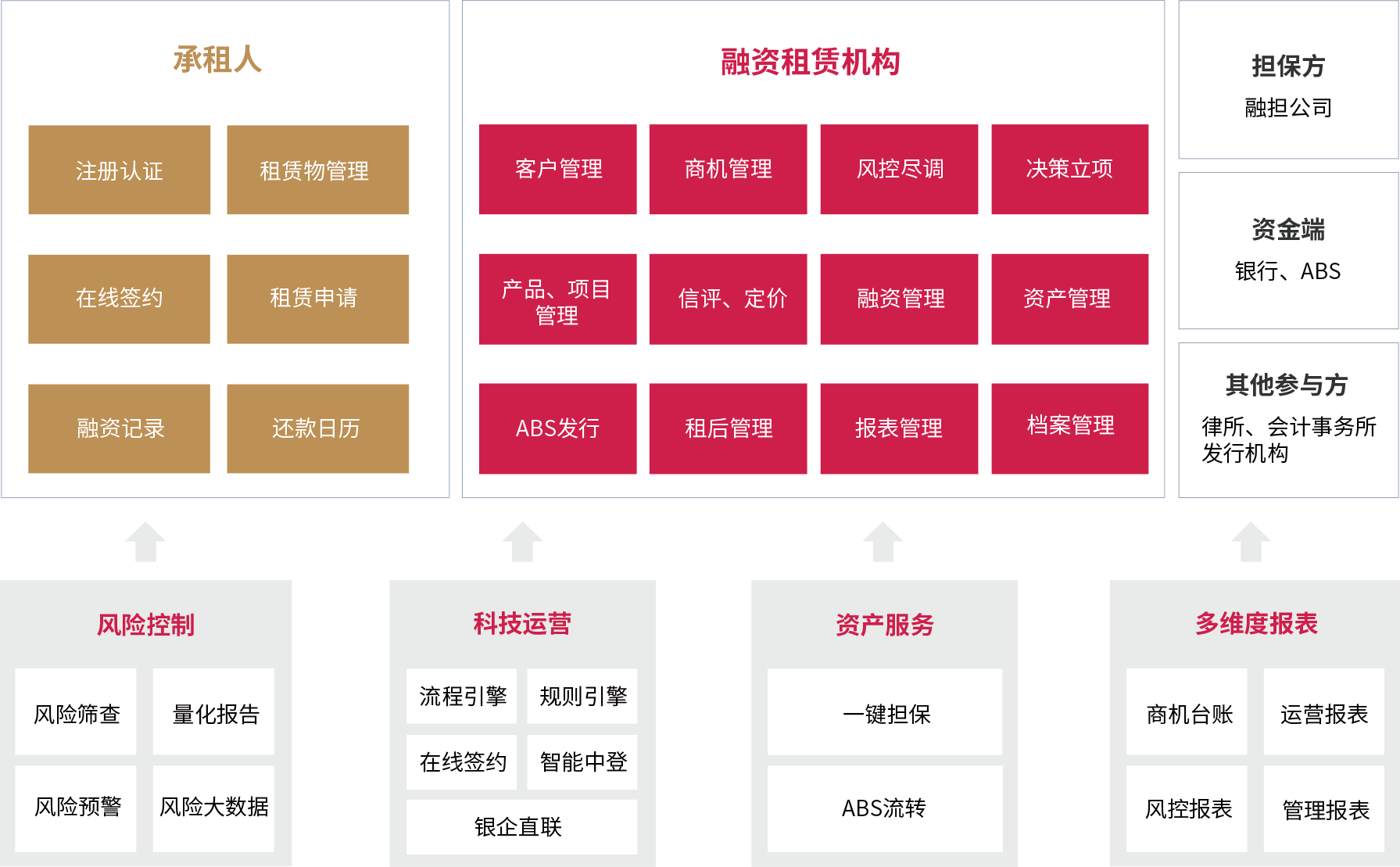 - 业务全过程管理租赁云全面覆盖融资租赁业务的各个环节,从租前的商机挖掘,到租中的项目立项、风控尽调、审批决策、融资放款,到租后的定期跟踪,资产管理、ABS发行和客户管理,提供业务过程的线上化管理和数字化支持;租赁云利用强大的流程引擎,为租赁公司提供业务流程的灵活定义和便捷管理,强化业务需求快速响应能力,提升业务效率;多维度数字化报表与分析报告,助力企业实现更高效的业务拓展和业务决策。